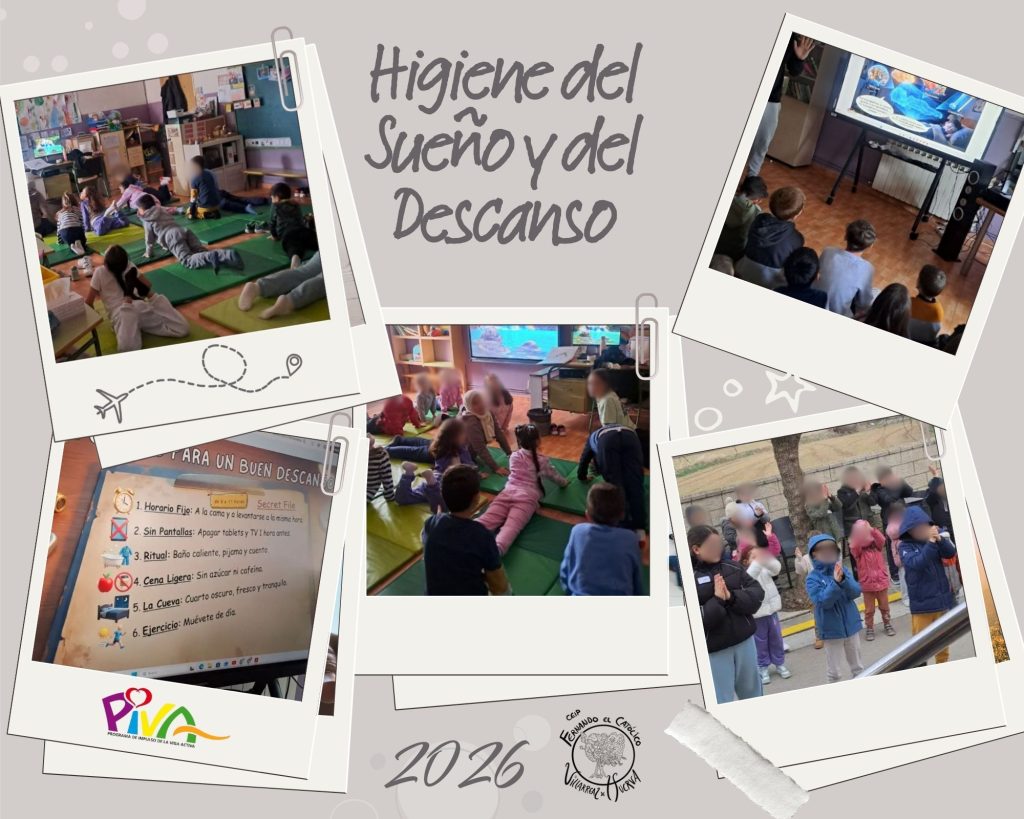 Durante el pasado mes de enero, en el CEIP Fernando el Católico (Villarreal de Huerva) hemos tratado la acción simbólica “Higiene del Sueño y del Descanso”. Le hemos dedicado mucho tiempo porque consideramos que es algo que todos y todas tenemos que mejorar en nuestro día a día desde alumnado hasta profes. Comenzamos el curso estableciendo rutinas de cada una de nuestras tardes entre semana para organizar estudio, actividades extraescolares y actividades deportivas y dedicar tiempo a todo lo importante que tenemos que prestar atención, adquiriendo además una serie de rutinas para el descanso diario.